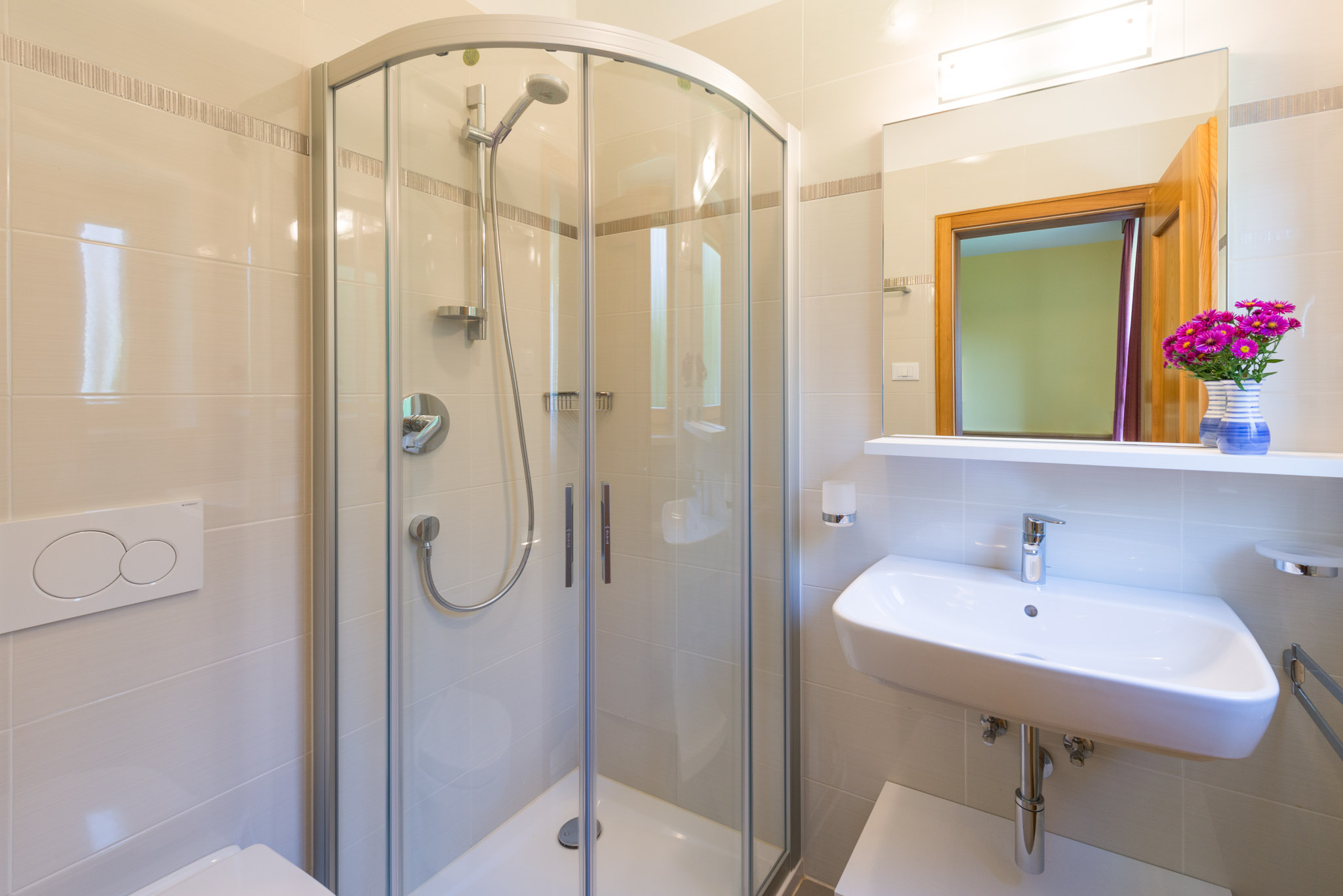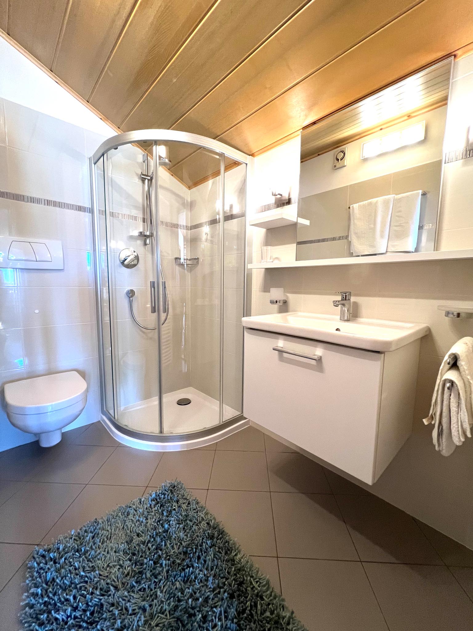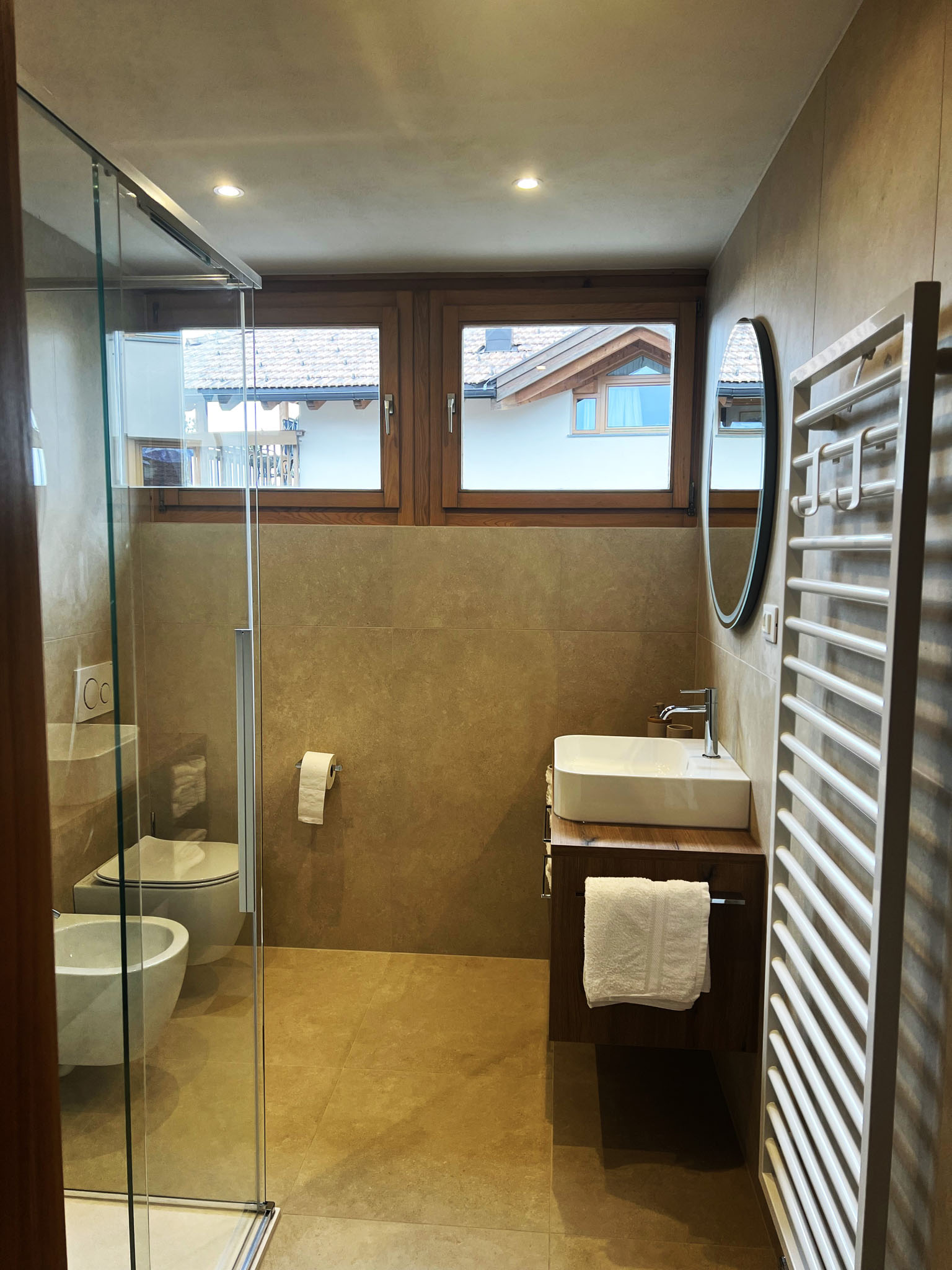 - 1 großes helles Bad mit Fenster, Dusche, Bidet, WC